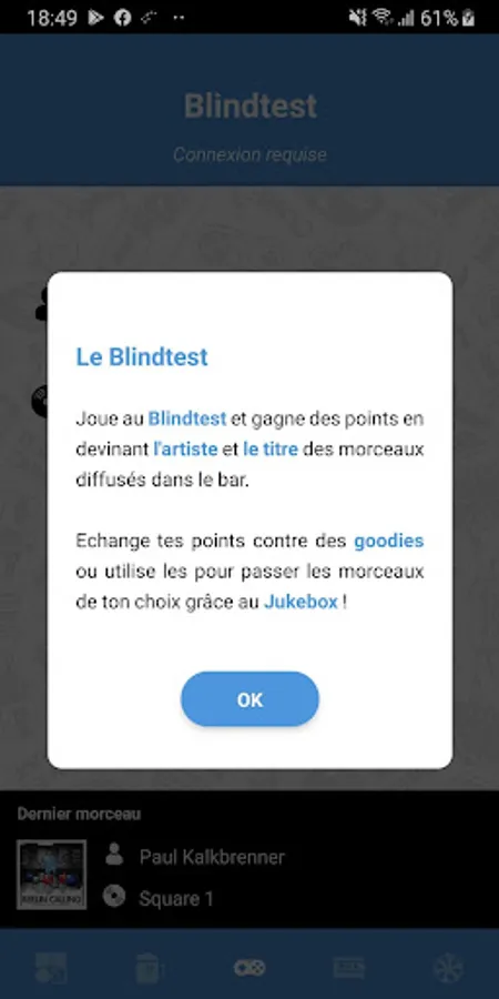 Play Blindtest: Guess the title of the song played, the artist and try to be the fastest. Earn and accumulate points on the app that you can redeem for gifts (goodies, consos, keychains ...).