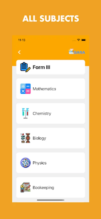 BARA app gives you access to comprehensive learning content for Physics, Chemistry, Biology, Mathematics, English, Kiswahili, Geography, History, Civics, Bookkeeping, and Commerce and Life skills for Secondary School, Primary School, and High School.