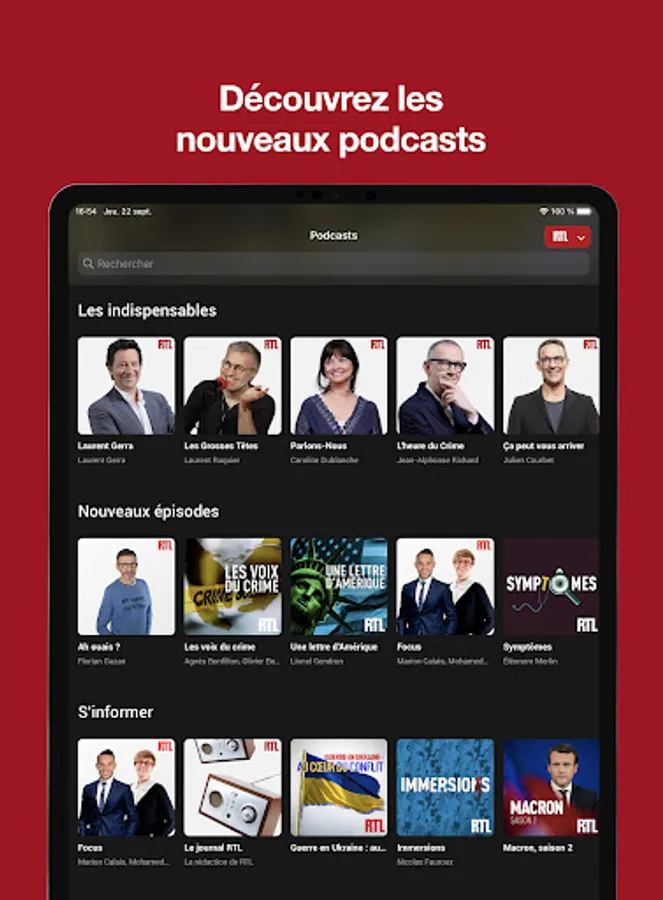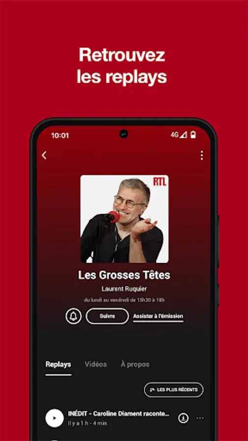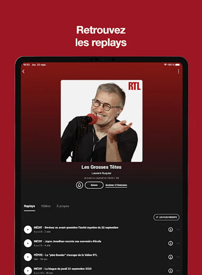 - Find easily in audio or video replay all the programs of the antenna: Les Grosses Têtes, Laurent Gerra, L'heure du crime, RTL Matin...