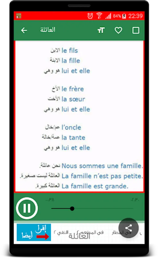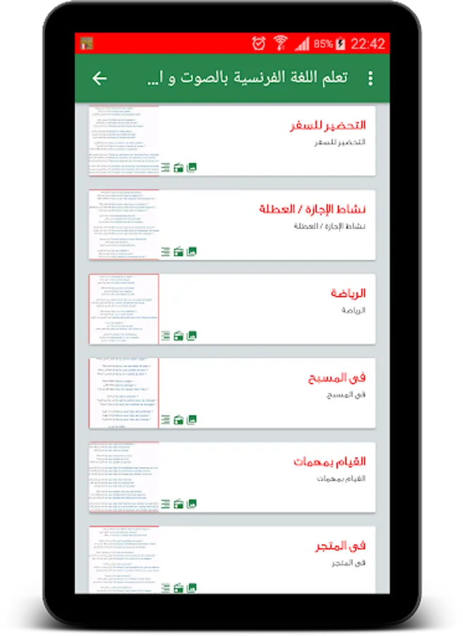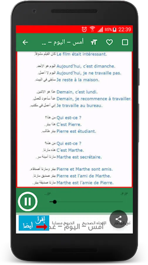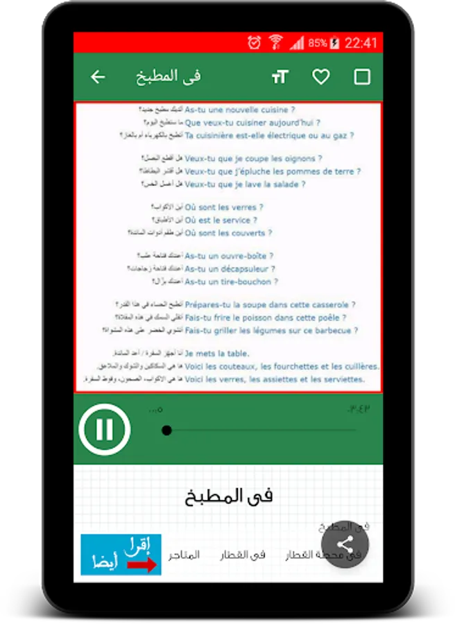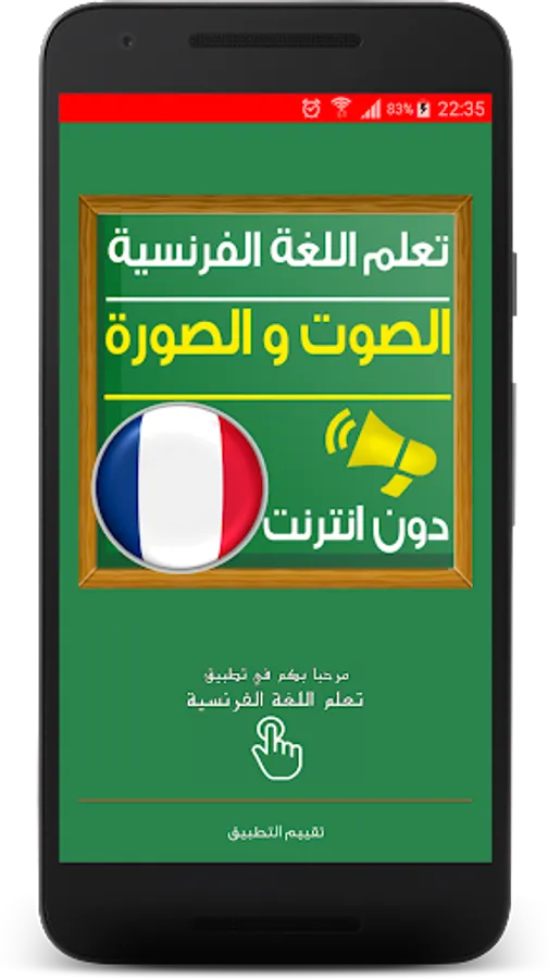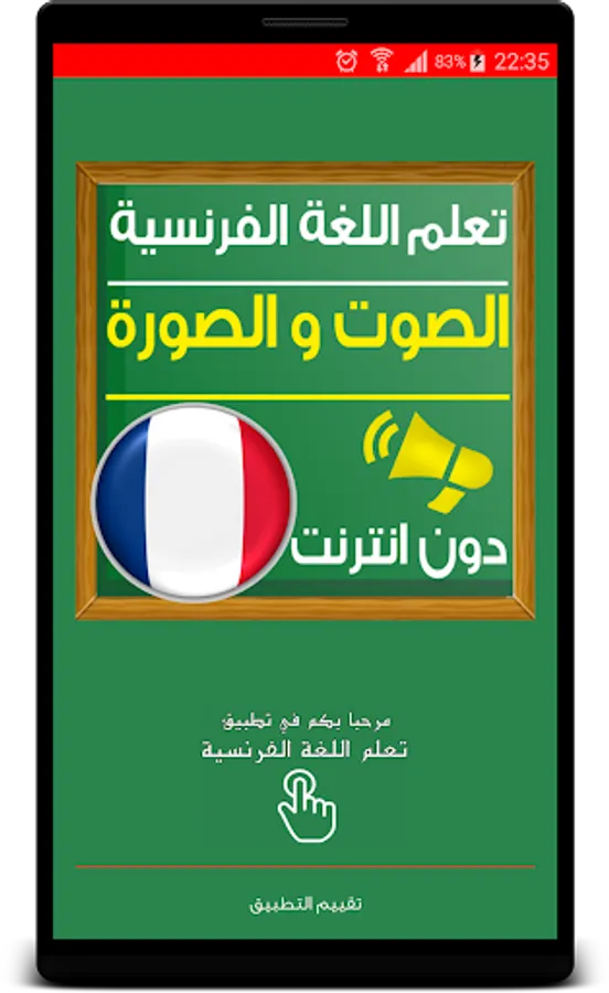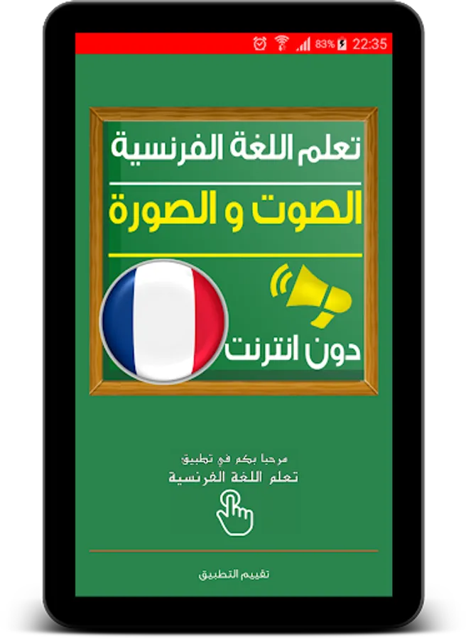 Through the application of learning French "Ta3alom Francais" you can learn the French language in the shortest and fastest time, an easy and interesting way and a large range of words and phrases frequently used and the corresponding French and pronunciation.