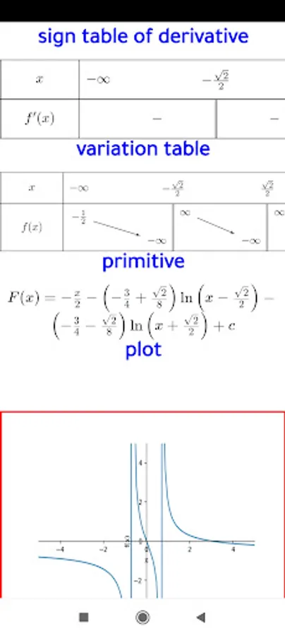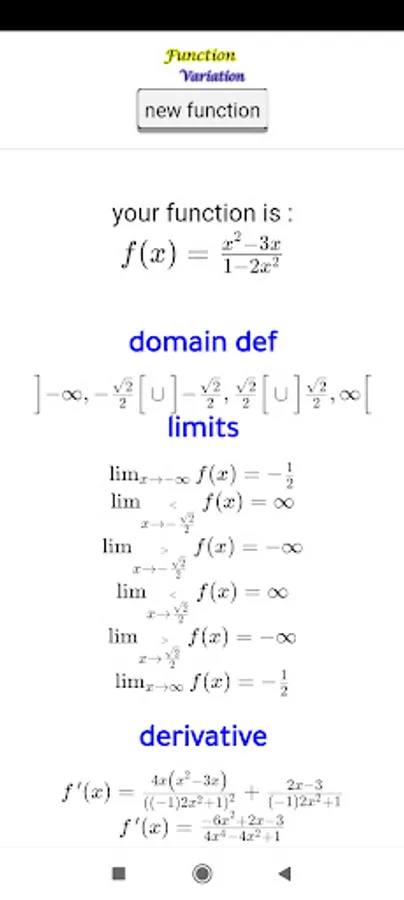 Math function variation app helps to study mathematical functions, and it presents the function definition interval, the limits, the derivative calculation, as well as drawing the sign table and the variation table,and finaly the calculation of the primitive of functions and the graphic representation