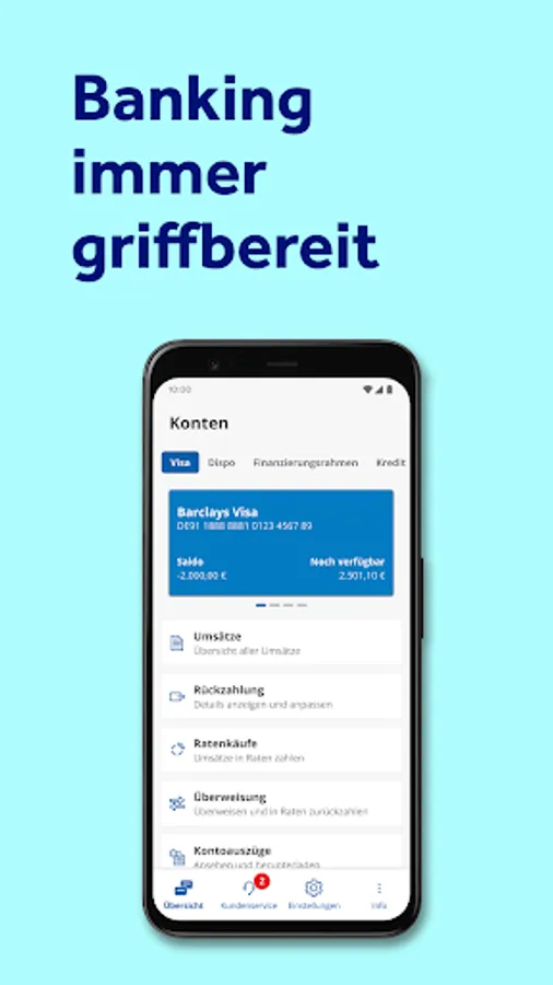 With the Barclays private customer app, you always have everything under control: Whether it's a credit card, installment loan, overdraft facility or financing framework.