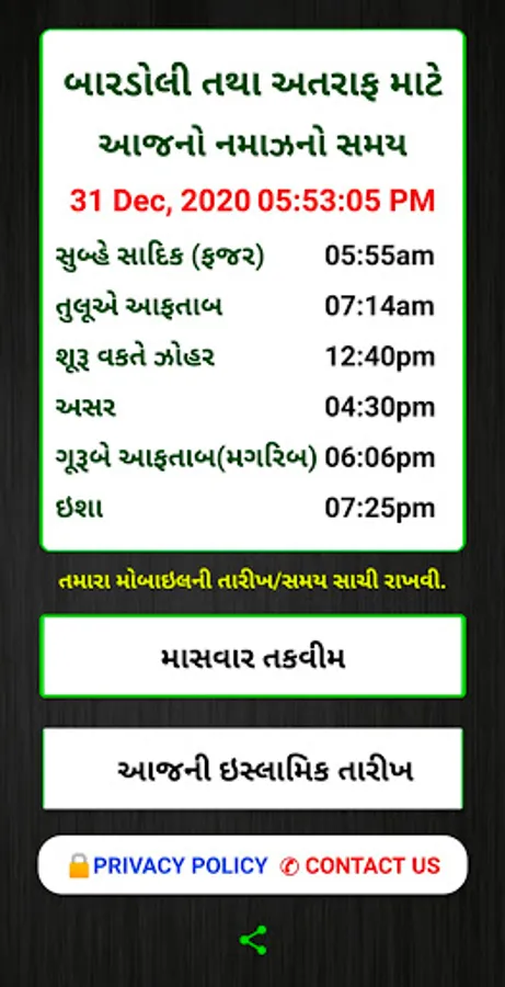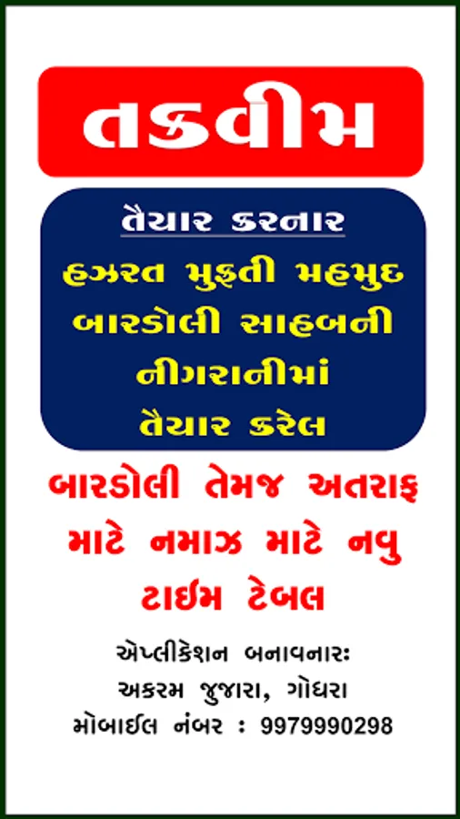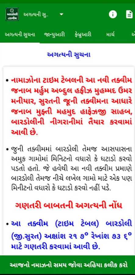 Bardoli Taqweem Application Thi Tame Bardoli Temaj Delaad, Gangadhara, Dhala, Haldharu, Timba, Mahuva, Sabhon, Karcheliya, Vankaner, Kadod, Tadkeshvar, Karanj, Nani Naroli, Varethi, Chikhli, Chasa, Aalipor, Khergam(Chikhali) Gamo Maate Namaz Nu Time Table Aasani Thi Jani Shakho Cho Je Latest Ganatri Par Aadharit Che