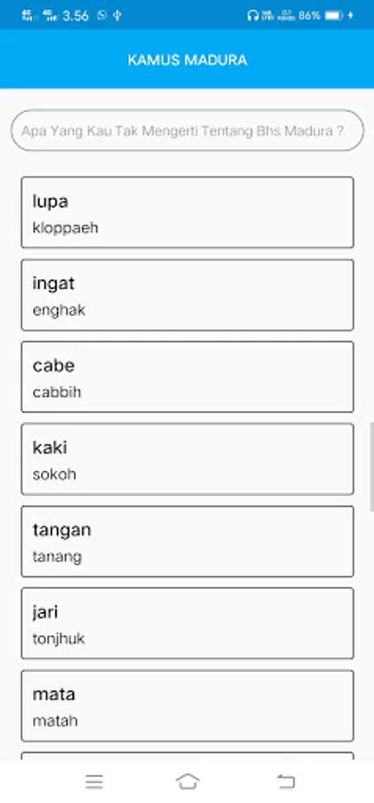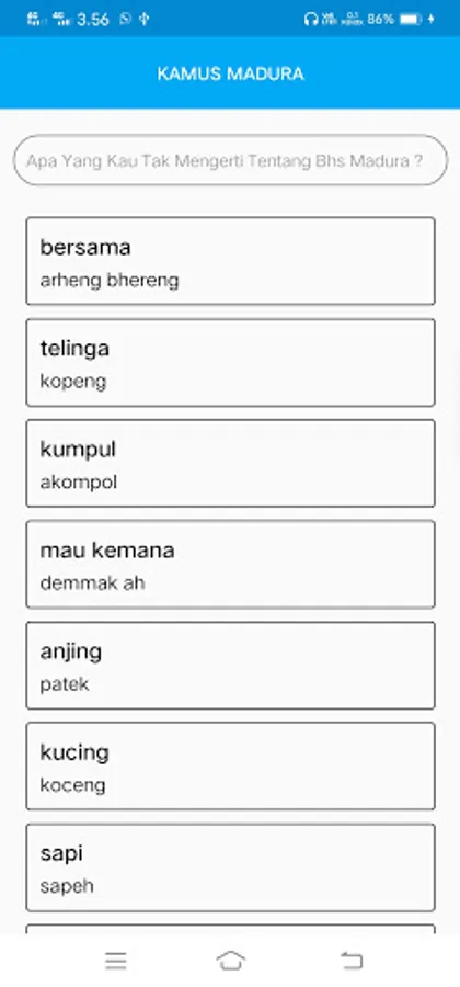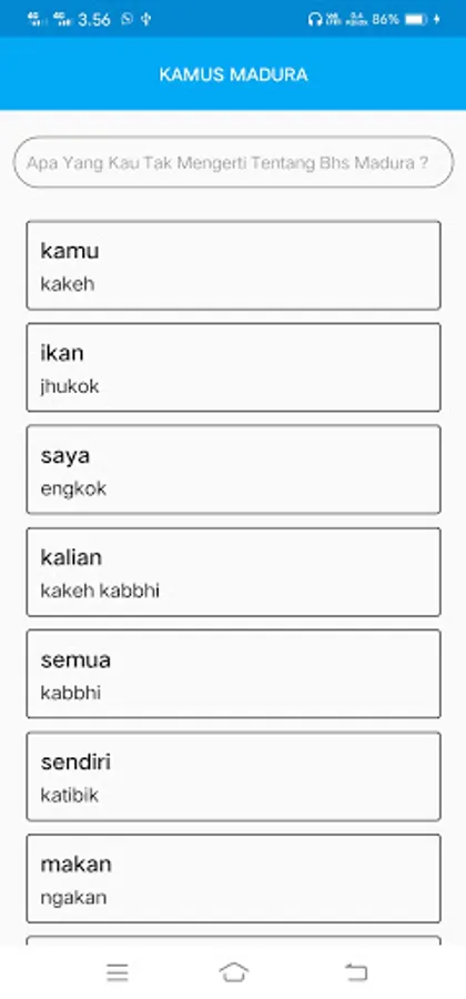 A SIMPLE MADURA DICTIONARY APPLICATION THAT IS NOT SO COMPLETE BUT INSHALLAH CAN HELP YOU EARTH CITIZEN WHO VALUES IN KEMADURA BUT DO NOT UNDERSTAND MADURA LANGUAGE