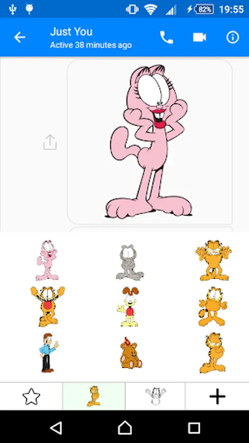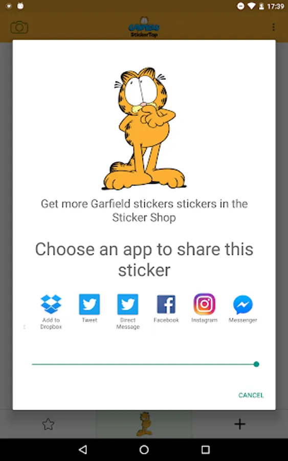 Garfield StickerTap makes it easy and fun to tap into 100s of emojis, stickers and animated GIFs based on Garfield. Simply tap an image in the gallery and send within your message, or add to a photo and share.