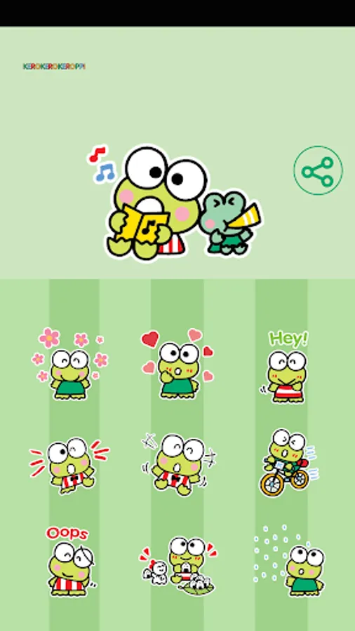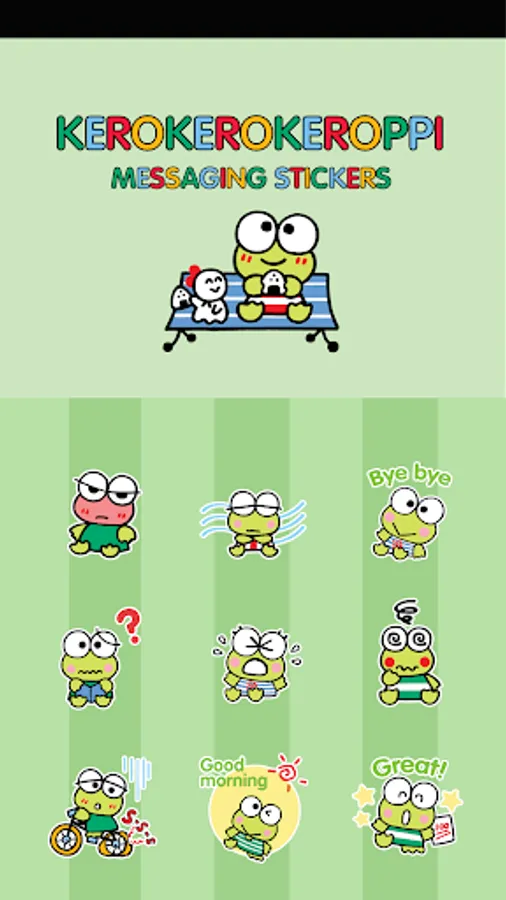 Rise and shine for the arrival of Kerokerokeroppi stickers! Brighten up your conversations with friends and loved ones with this fun-loving frog. Pack contains 30 static stickers.