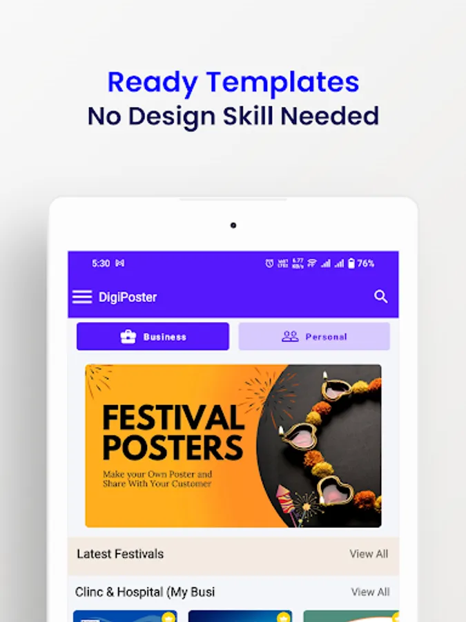 Unleash your creativity and design eye-catching posters, flyers, banners, templates, festive greetings, birthday greetings, invitation cards, motivational quotes, cover photos, thumbnails, collages, and high-quality ads with just a single click using DigiPoster.