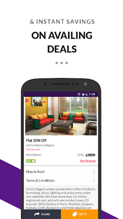 APP NOTIFICATION: Get instant notification about the latest deals and offers on your mobile. Also, get notified about your recent transactions, nearby deals around you, reward announcements, company news, discounts offered by restaurants and more.