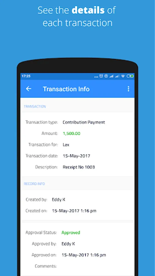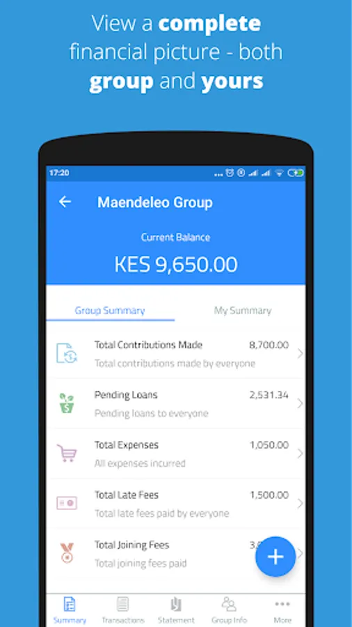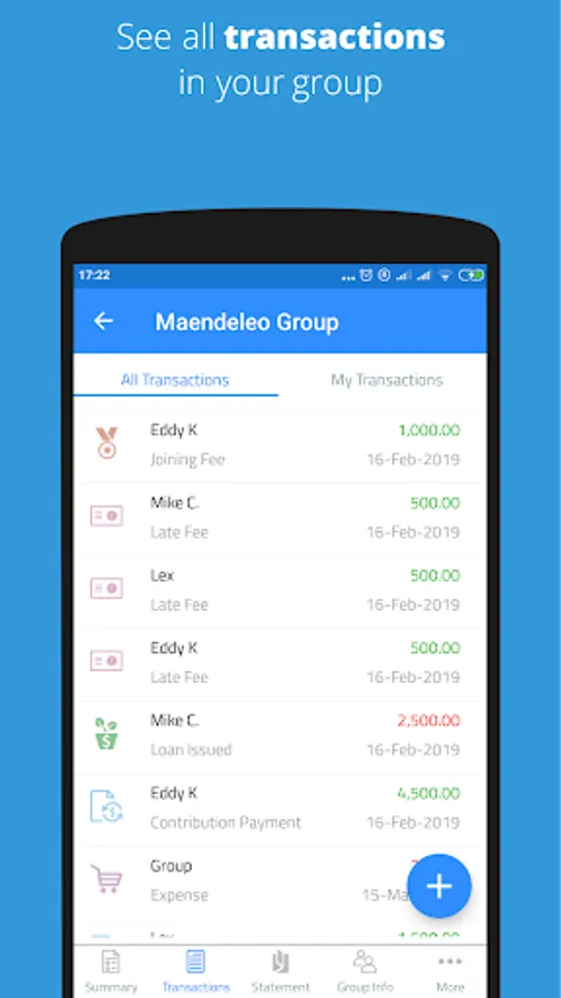 • The administrator add transactions for the group (contribution payments, expenses, merry-go-round etc.)