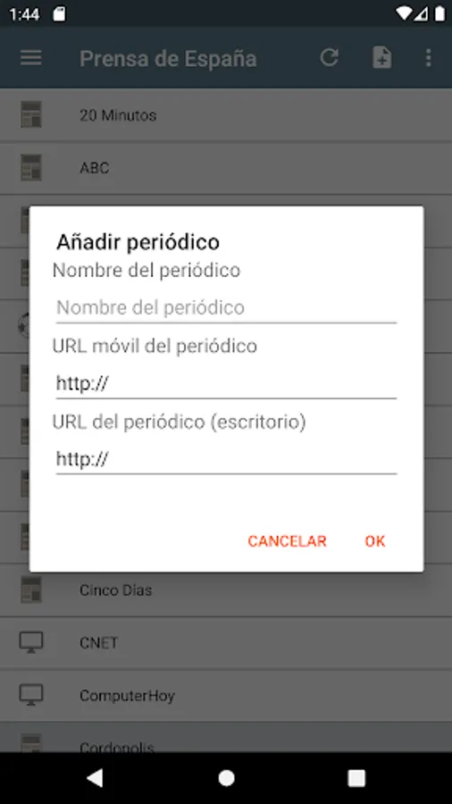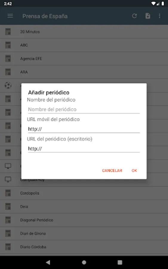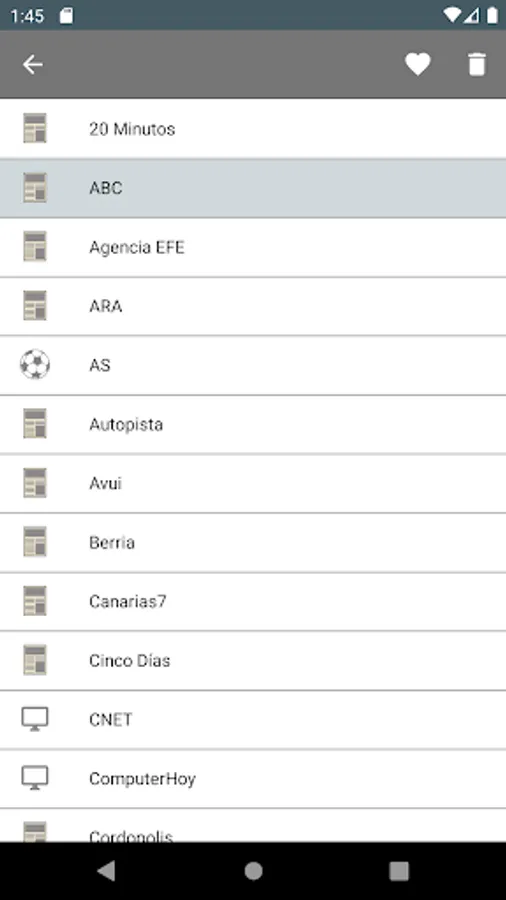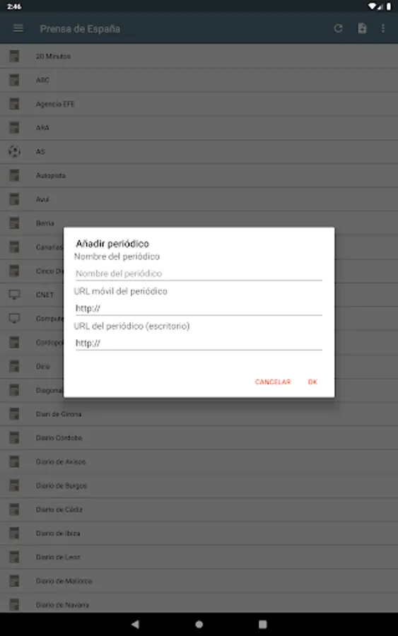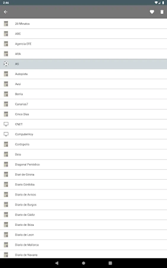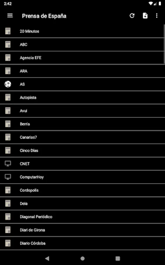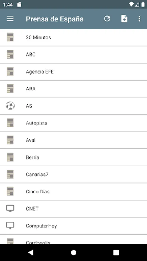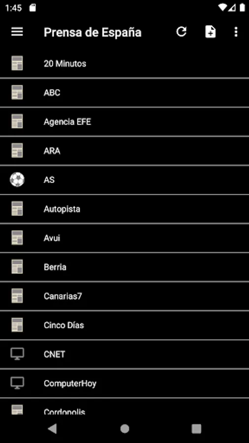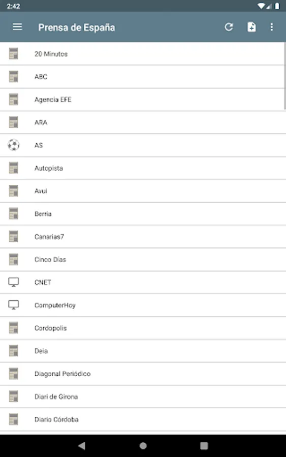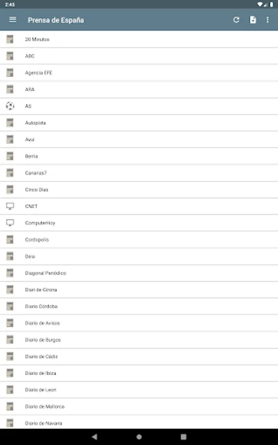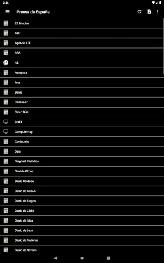 Read major Spanish newspapers, news sites online. You can find news from 20 Minutos, ABC, ADN, Agencia EFE, ARA, AS, Avui, Berria, Canarias7, Cinco Días, Cotizalia, Diari de Girona, Diario Córdoba, Diario de Avisos, Diario de Cádiz, Diario de Ibiza, Diario de Leon, Diario de Mallorca, Diario de Navarra, Diario de Noticias de Navarra, Diario de Sevilla, Diario Hoy de Extremadura, Diario Información, Diario Sur, El Comercio Digital, El Confidencial, El Correo, El Correo Gallego, El Dia, El Dia de Cordoba, El Diario Montañés, El Diario Vasco, El Economista, El Periodico Extremadura, El Periodico de Aragon, El Mundo, El Norte de Castilla, El País, El Periódico de Catalunya CAT, El Periódico de Catalunya ES, El Singular, Elle, Euronews, Expansión, Faro de Vigo, Google Noticias, Heraldo de Aragón, Hoy Tecnología, Ideal, La Gaceta, La Nueva España, La Opinión Coruna, La Opinión de Granada, La Opinión de Malaga, La Opinión de Murcia, La Opinión de Tenerife, La Opinión de Zamora, La Razon, La Región, Las Provincias, La Vanguardia, La Verdad, La Voz de Galicia, La Voz, LevanteEMV, Libertad Digital, Marca, Menéame, Mundo Deportivo, Muy Interesante, Público, Qué, RTVE, Sport, Super Deporte, Terra, Ultima Hora...
