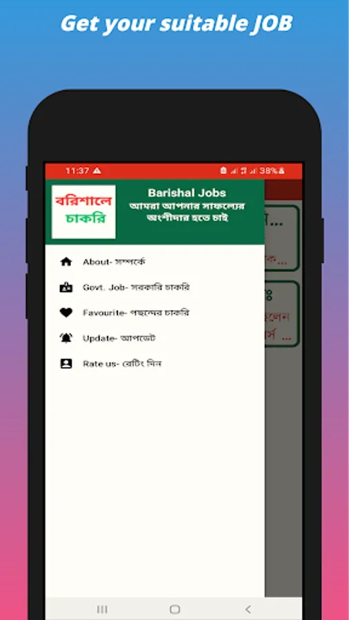 Barishal jobs এপসের মাধ্যমে চাকরির বিজ্ঞপ্তি আমরা বিভিন্ন সংস্থার নিজস্ব মাধ্যম এবং বিভিন্ন পত্রিকাসহ নানাবিধ ওয়েবসাইট থেকে চাকরিগুলো আপনাদের সামনে উপস্থাপন করি। এখানে বরিশালে যারা বসবাস করেন শুধু তাদের জন্যই চাকরি সমুহ পোস্ট করা হয়ে থাকে। সাথে যেসব সরকারি চাকরি তে বরিশালের প্রার্থীরা আবেদন করতে পারবে সেগুলোও আমারা প্রতিয়িনত পোস্ট করে থাকি। একজন শিক্ষিত বেকার ই জানে যে বেকারত্ব কত কষ্টের তাদের সেই কষ্ট কিছুটা হলেও কমাতে সাহায্য করবে এই Barishal jobs এপস। প্রত্যেকটি জবস আলাদা আলাদা ফাইল করা আছে। ছবি এবং লেখা দেয়া আছে। চাইলেই বিজ্ঞপ্তিটি ডাউনলোড করতে পারবেন এবং লেখাগুলো রোবোটের মাধ্যমে শুনতে পারবেন। পছন্দের চাকরিটি ফেভারেটে সেভ করতে পারবেন, অন্যদের সাথে শেয়ারও করতে পারবেন। এপসটিতে শতভাগ বিশুদ্ধ চাকরির পোস্ট দেয়া হবে। নিয়মিত চোখ রাখতে পারেন এপসে এবং কোন ভূল ত্রুটি পেলে তা আমাদের জনানাতে ভুলবেন না।