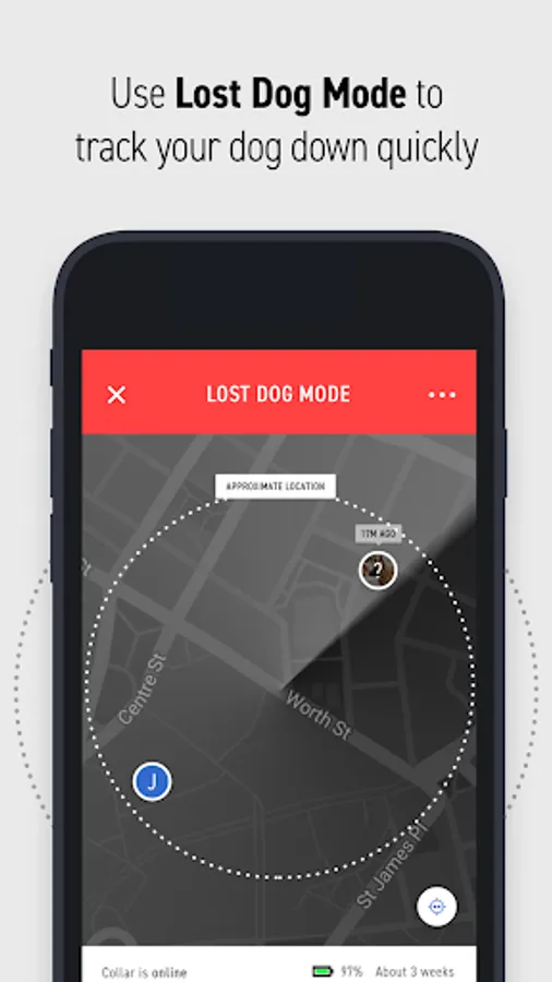 We’re putting an end to lost dogs. If your dog’s got out, enable Fi’s unique Lost Dog Mode at the click of the button. A red light will appear on their collar, and the collar will report its location every minute as they move. Make sure you never lose hide and seek again, with Fi.