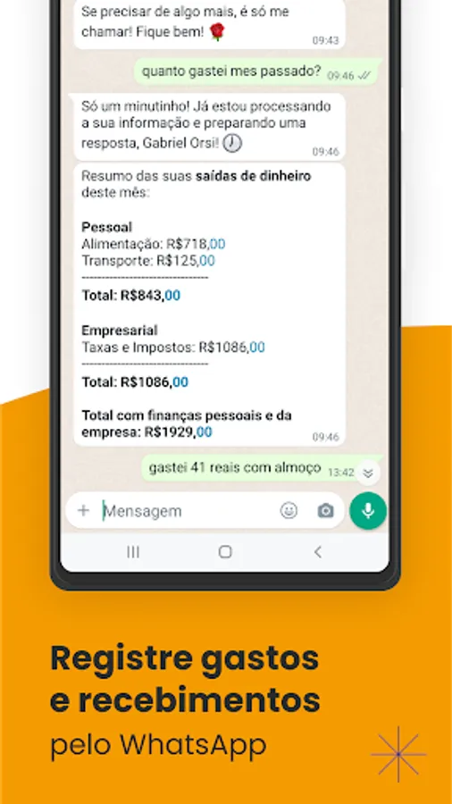 This approach allows you to order financial reports and get instant updates on your cash flow. This essential information is at your fingertips, both on WhatsApp and in the app, in an accessible and practical way.