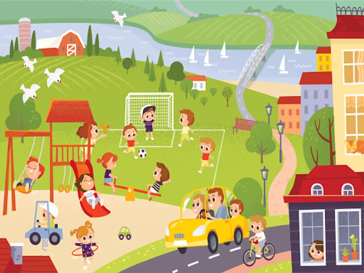 When you press start, you enter a rural setting. There you can see children, toys, houses and cars.