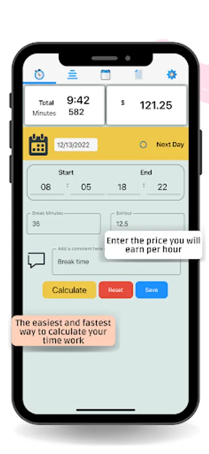 4. If you have taken a time break, indicate how many minutes, the app will subtract those minutes from your hours and minutes worked.