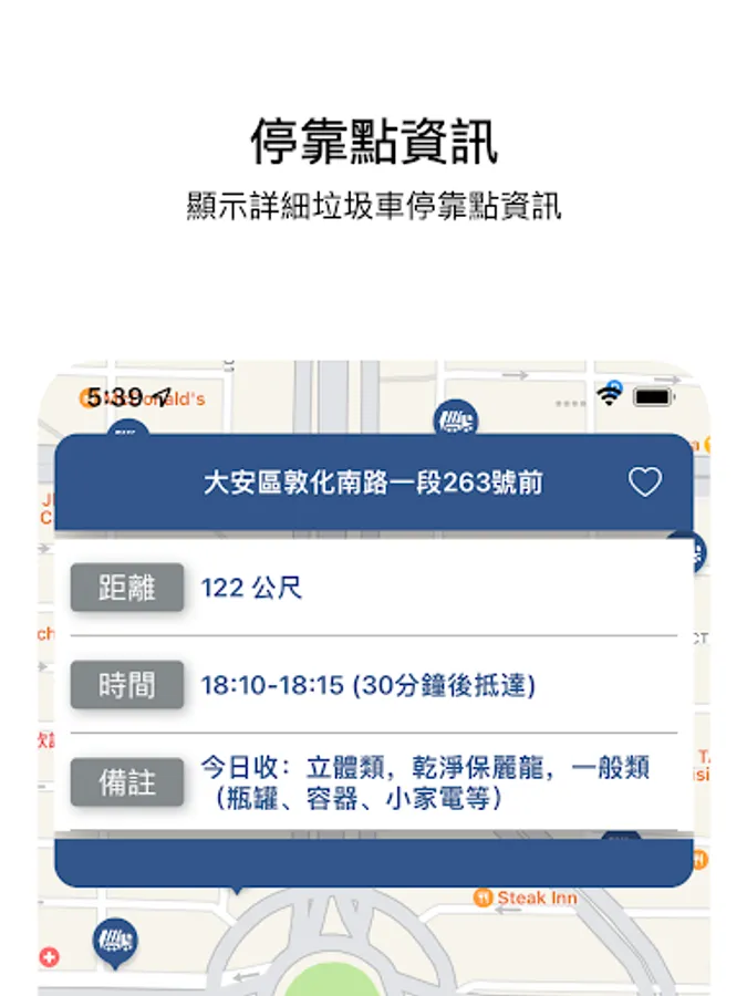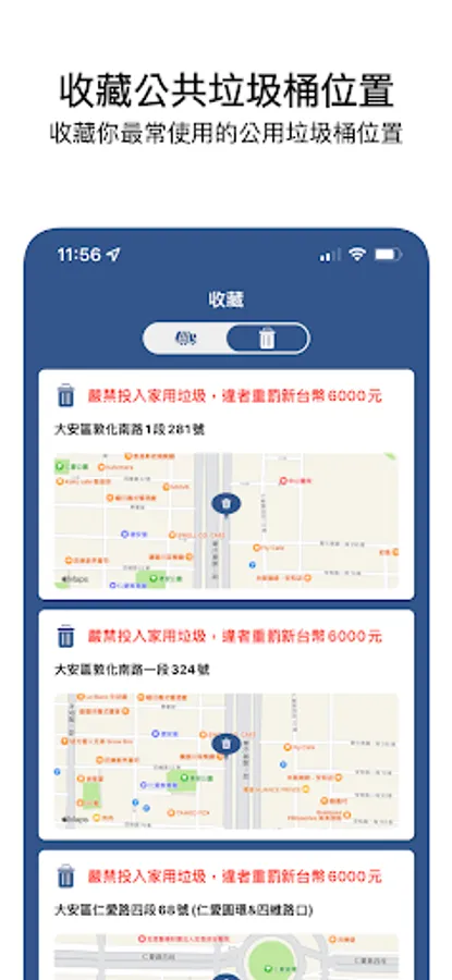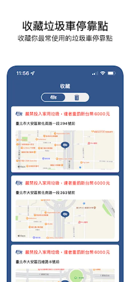 • Favorite stations: You can add garbage truck stations and pedestrian trash cans to your favorites, and quickly browse the location and time of the stations.