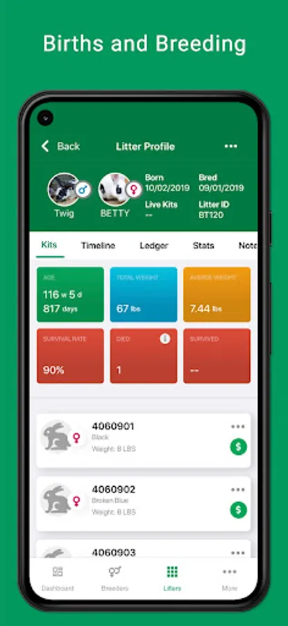 Compare breeder and litter performance and track rabbitry statistics to build more output from your breeders for show, pets, meat, pelts or fur.