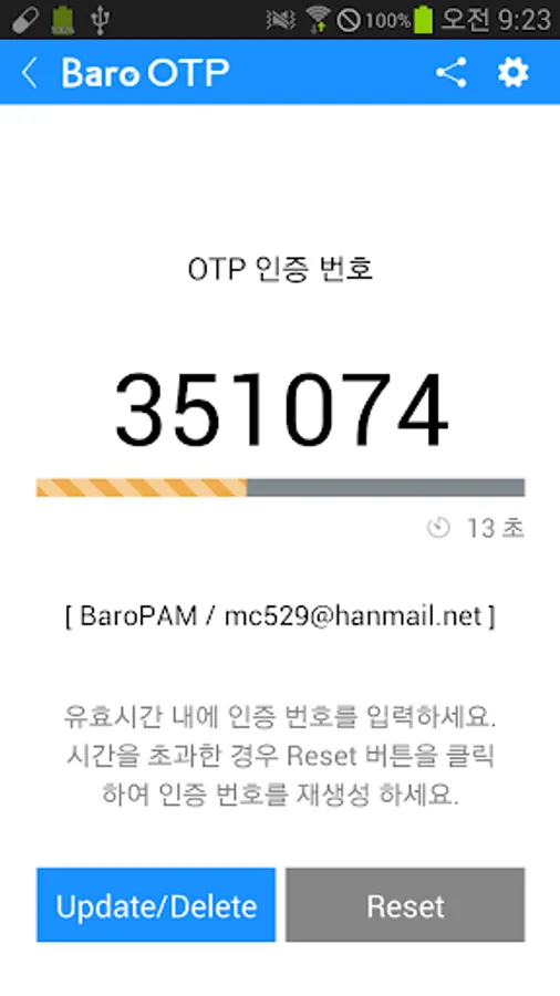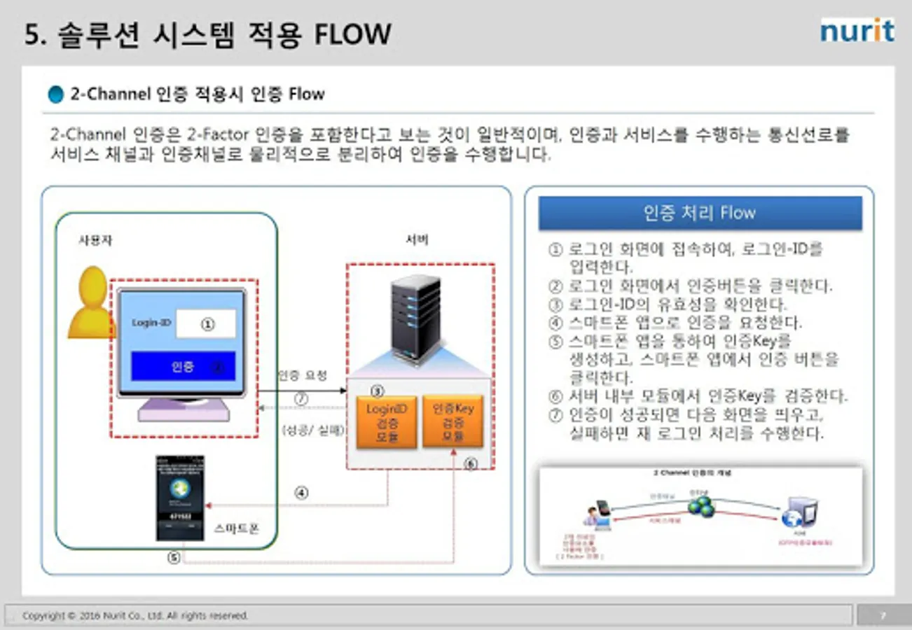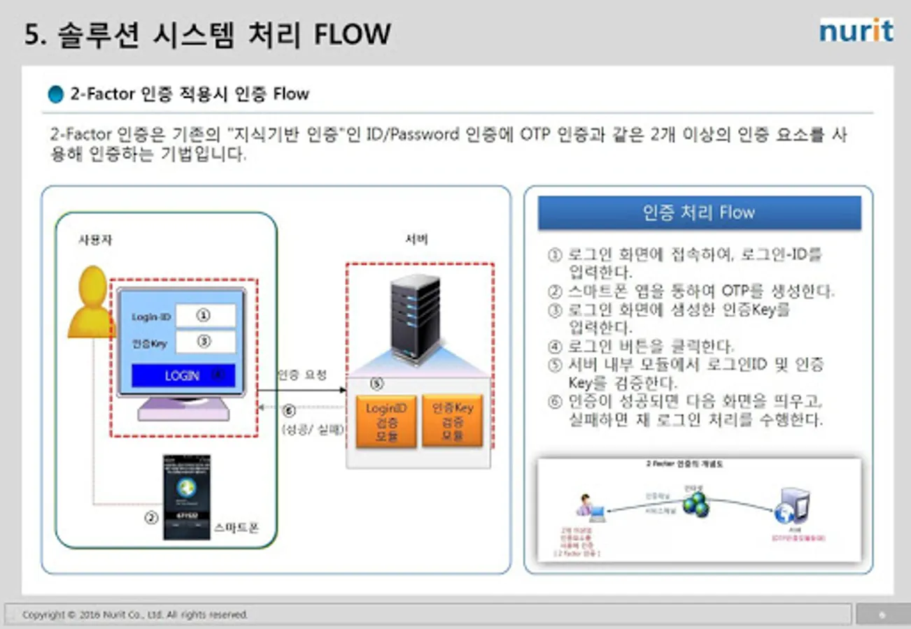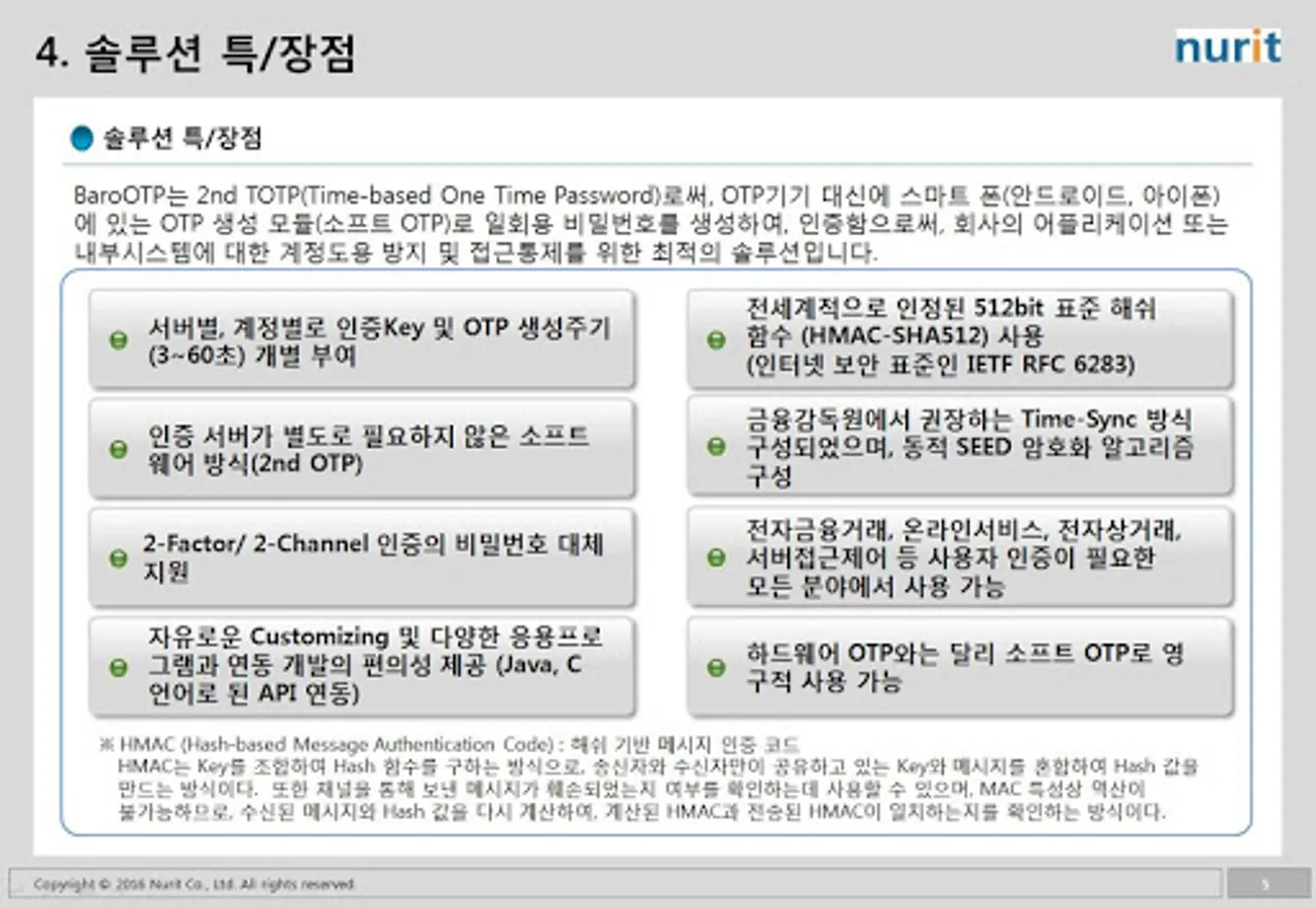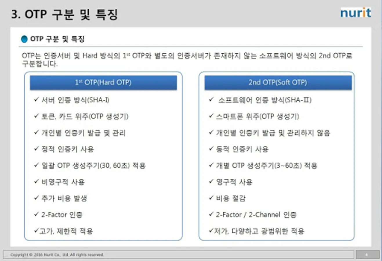1) In order to receive user authentication, a new OTP must be used every time. It is volatile and can only be used once, and it is safe even when ID/PW is leaked.