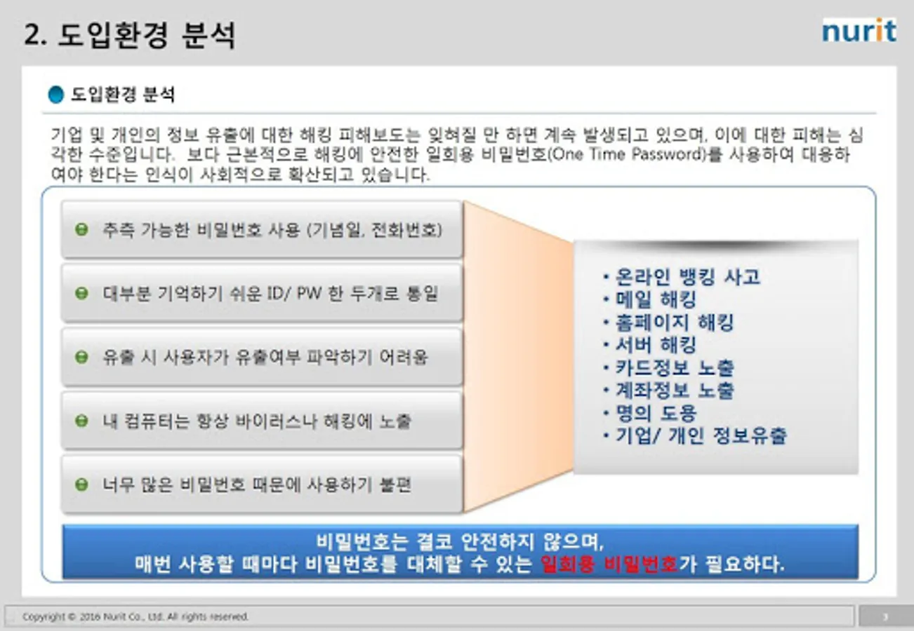 Hacking damage for corporate and personal information leakage (online banking accident, email hacking, website hacking, server hacking, card information exposure, account information exposure, identity theft, company/personal information leakage) reports continue to occur as long as they are forgotten. And the damage to it is serious. More fundamentally, there is a growing social awareness that it is necessary to respond to hacking by using a safe one-time password.
