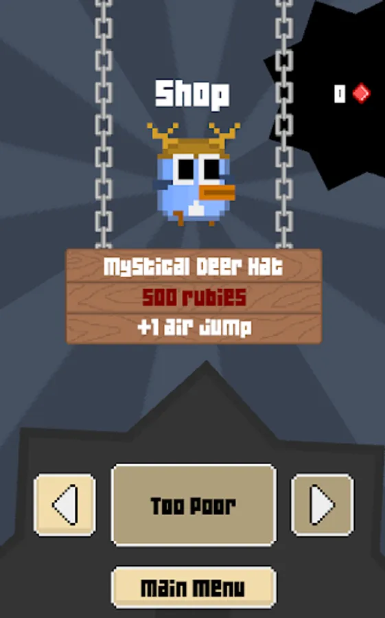 Touch to make penguin-bird jump! Collect 50 rubies to beat the game! Hop all the way to the top like a ninja. Try different hats for different abilities in normal mode.