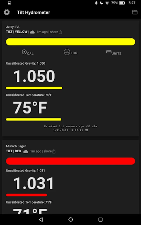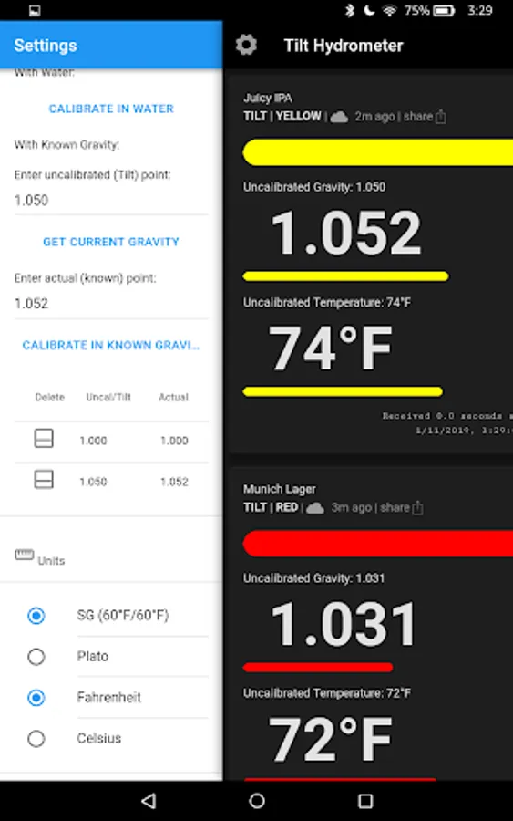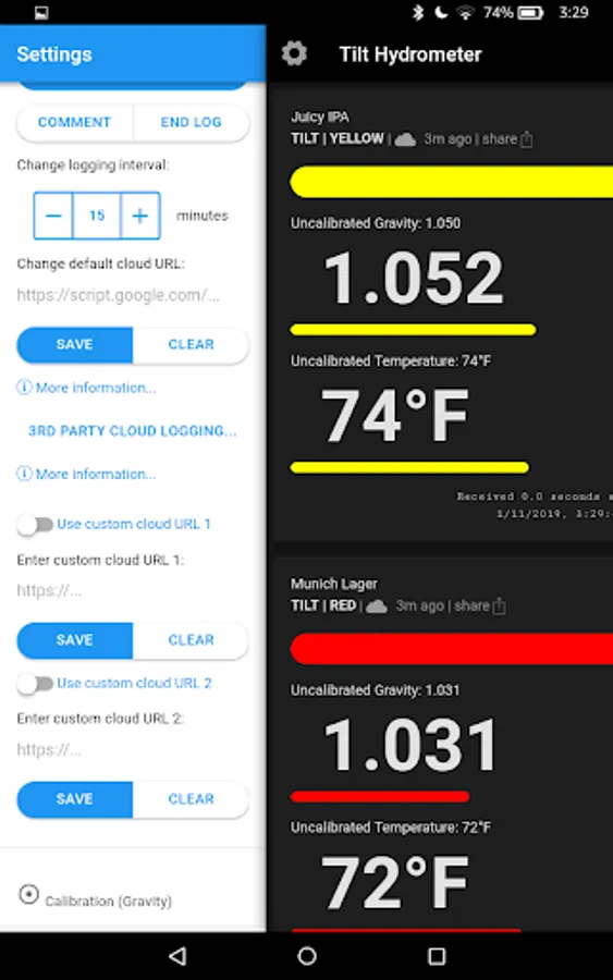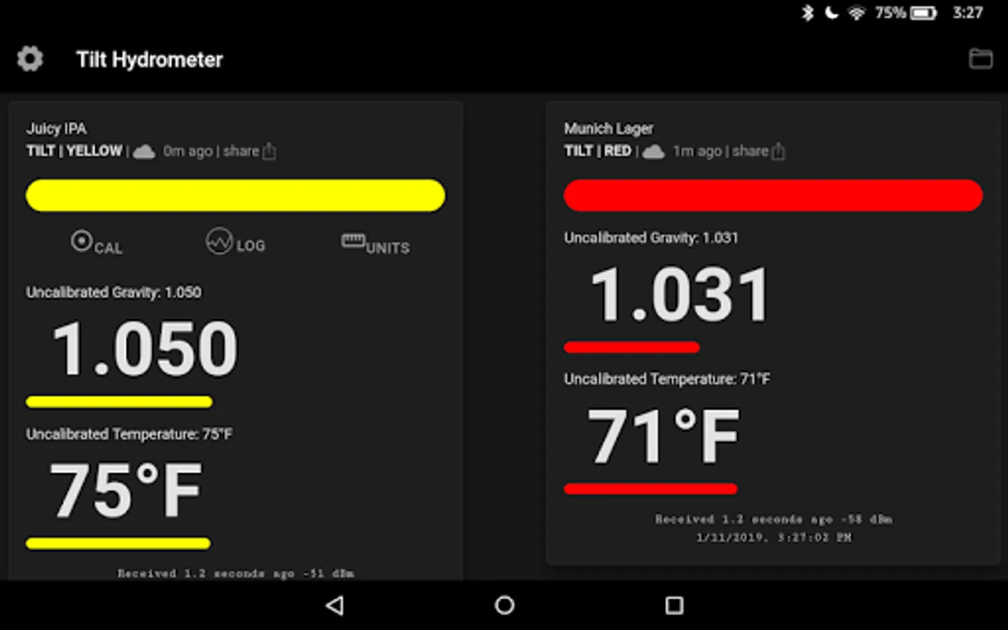The Tilt 2 app is the official app for TILT hydrometers. Use the app to log specific gravity and temperature data to the cloud such as Google Sheets or other custom cloud endpoint. We support brewfather.app, brewstat.us, monitor.log and Grainfather.com among others. (Visit their respective websites to get more information on setting up the app). You can also log directly to your phone or tablet and email a CSV to yourself or others. Note that when logging you will need to be within range of your Tilt or have a phone or tablet setup next to your fermentation vessel for automatic continuous logging. (Highly recommended!). You can also calibrate your Tilt and change units from degrees Fahrenheit to Celsius and from specific gravity (60°F/15.6°C) to degrees Plato.