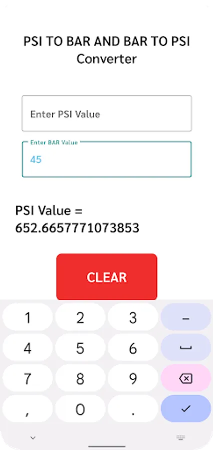 Conversions from PSI to Bar and from Bar to PSI are also possible.