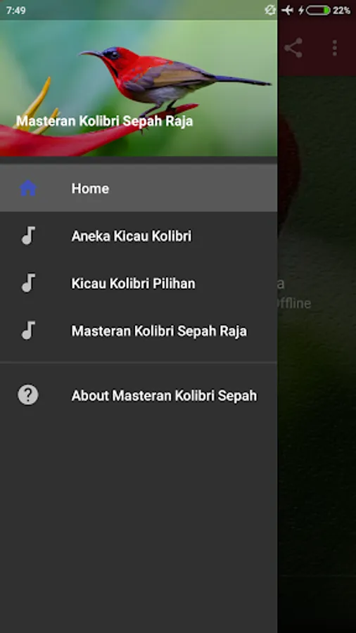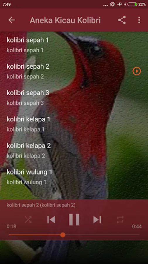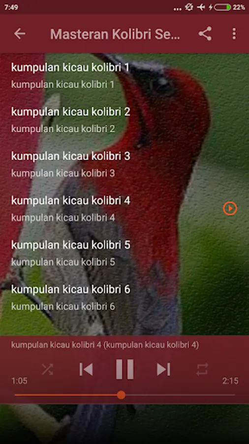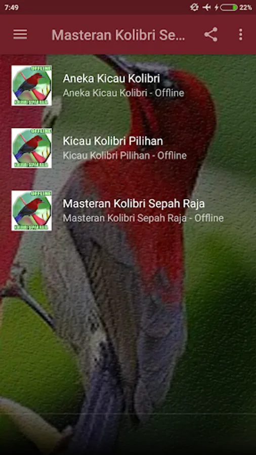 Masteran Kolibri Sepah Raja Gacor Mp3 offline: many different sounds of hummingbirds sepa Raja gacor mp3 offline. Come on for all of you who want and like to listen to the sound of hummingbirds sepah king gacor champion for masteran then you can install and use this one application. To run and listen to this application you don't need to be connected to the internet so it is very easy and simple.
