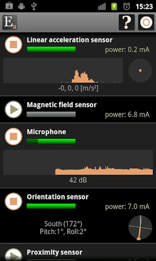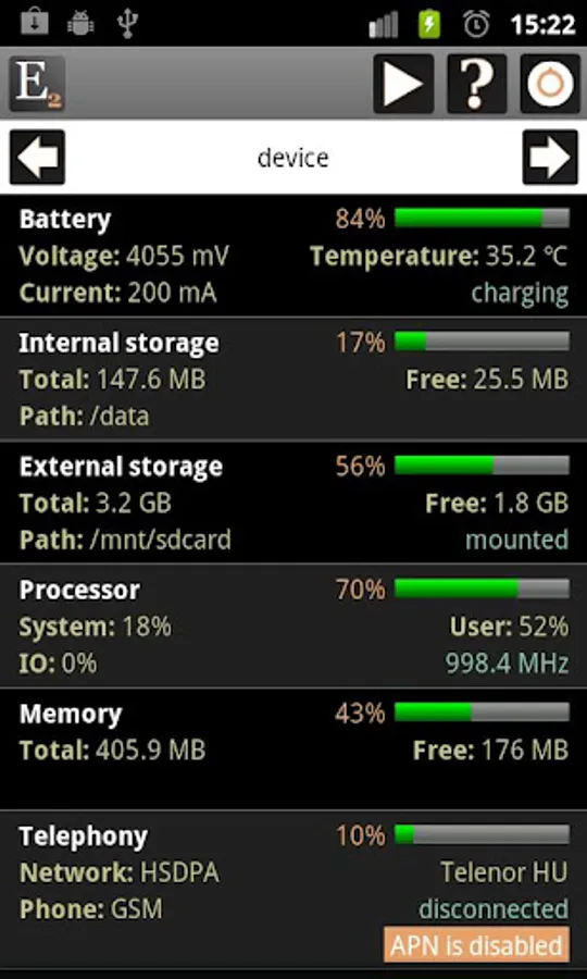 - displays hardware information: battery, internal/external storage, cpu, memory, telephony, wifi, bluetooth, nfc, location, display, audio, airplane mode, camera, camcorder, input devices, usb