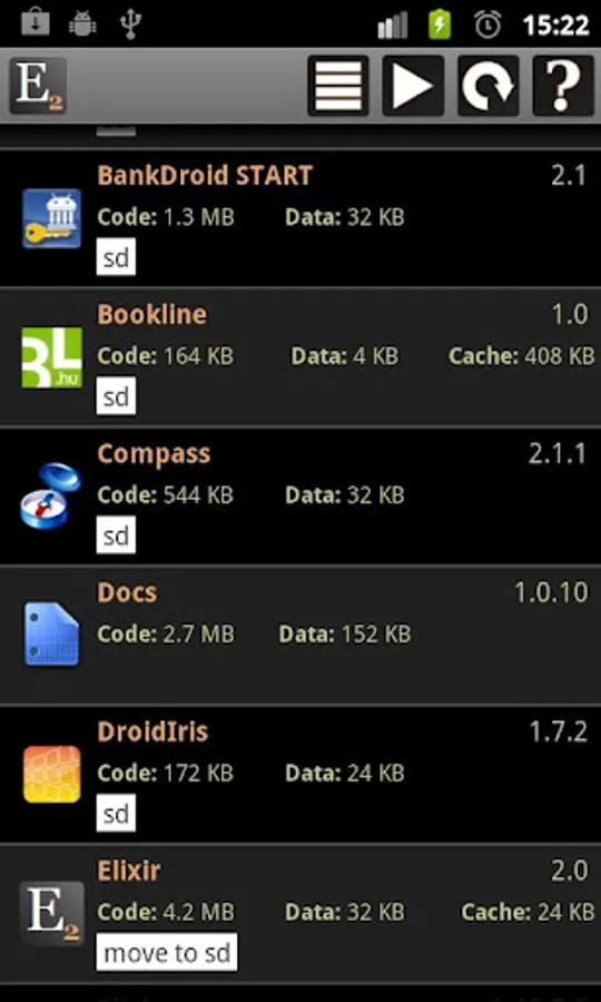 - displays installed applications: code, data and cache size, network traffic; launch, uninstall, clear cache, move to sd, organize applications by labels, batch mode, enable/disable applications or components