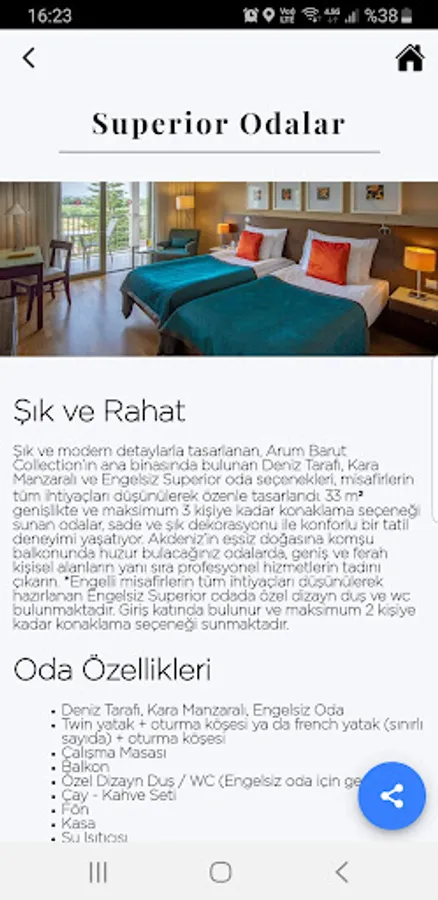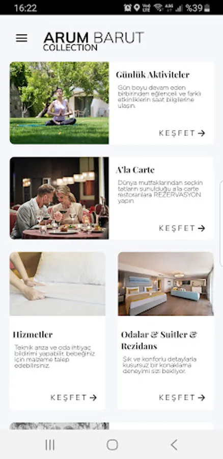 The application allows speeding up the check-in process by entering personal information in the Pre Check-in section before arriving at the hotel. You can have detailed information about your room and you can make a la carte restaurant reservations during your stay at the hotel. You can send us all your requests and needs instantly, and you can also write your comments about all the services you receive and send them via the application as a survey.