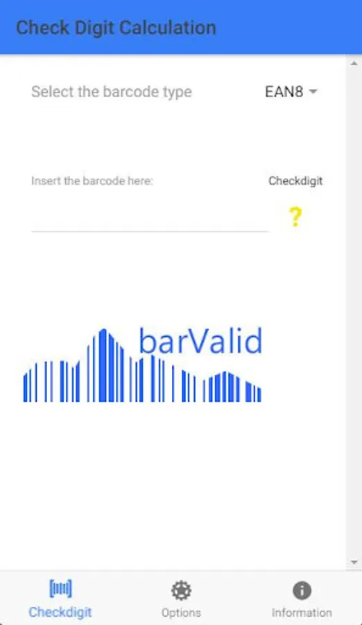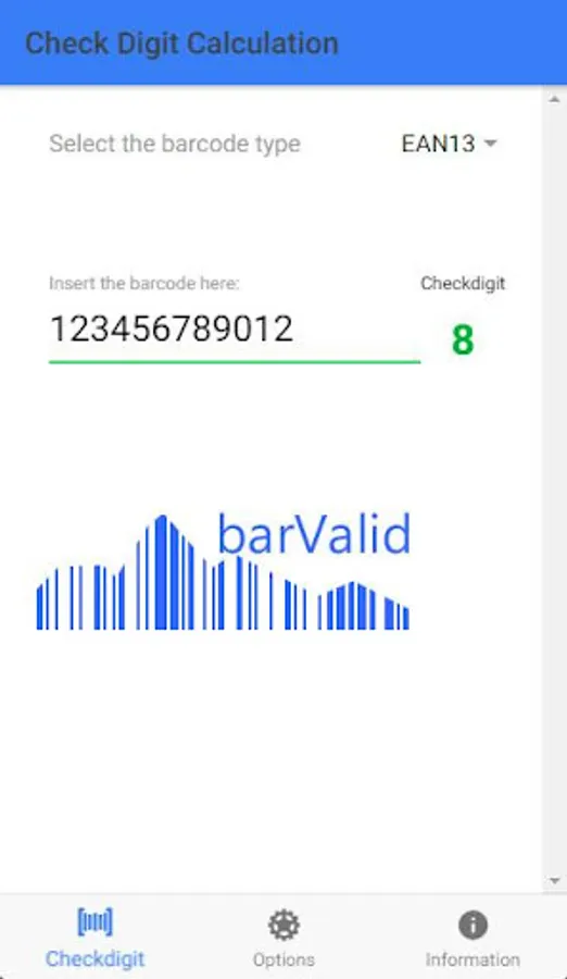 Just select the desired code type and barValid will calculate the check digit of a given code.