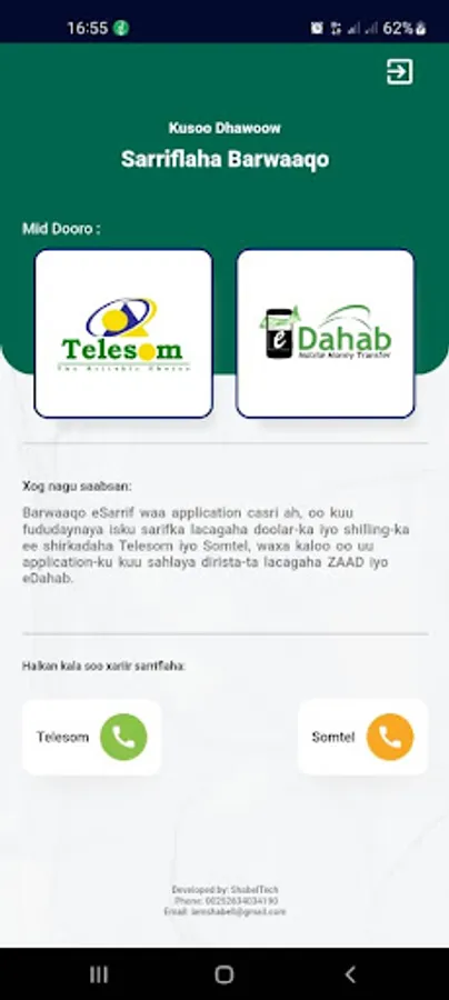 Barwaaqo eSarrif waa application casri ah, oo kuu fududaynaya isku sarifka lacagaha doolar-ka iyo shilling-ka ee shirkadaha Telesom iyo Somtel, waxa kaloo oo uu application-ku kuu sahlaya dirista-ta lacagaha ZAAD iyo eDahab.