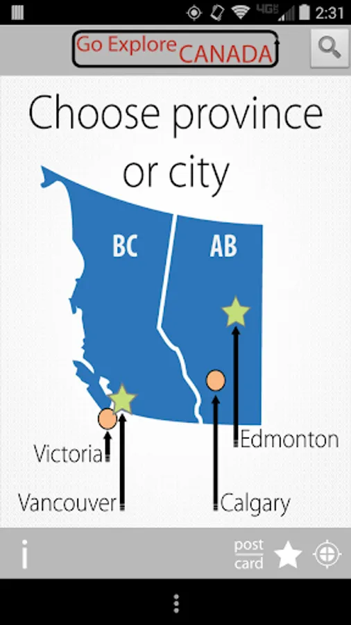 Provinces and Territories covered in the goExplore Canada app are British Columbia, Alberta, Saskatchewan, Manitoba, Ontario, Quebec, New Brunswick, Prince Edward Island, Nova Scotia, Newfoundland and Labrador, Yukon, Northwest Territories and Nunavut.