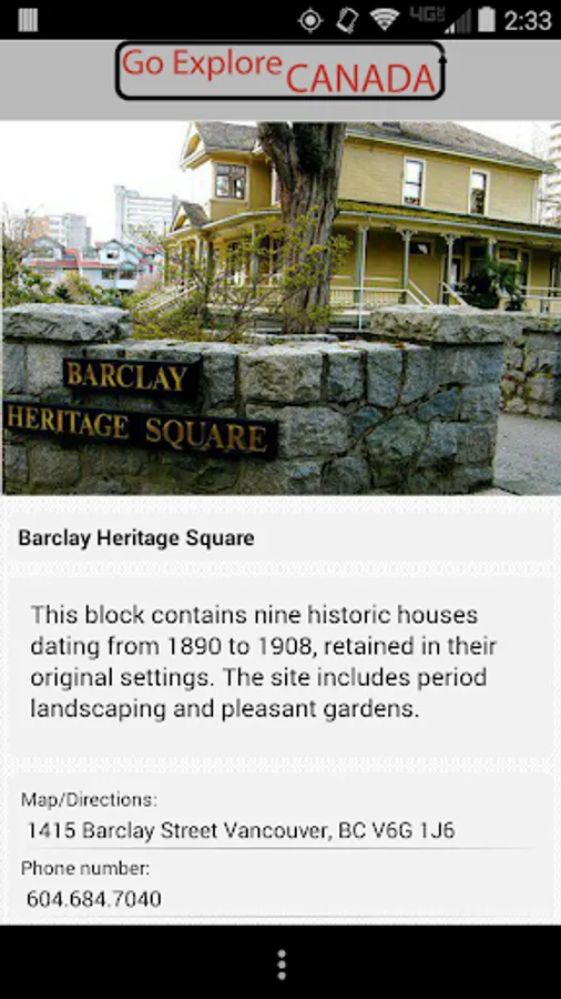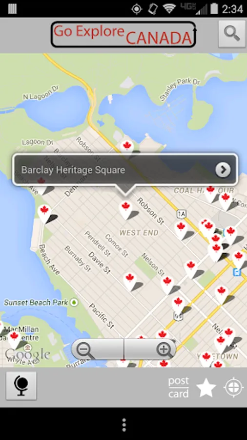 go Explore Canada uses the familiar Google map locating you as a pulsating blue dot (GPS activated) surrounded by color-coded pins (Points of Interest)