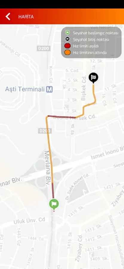 Journey analysis reports. Display of trip duration, distance, top speed and average speed data.