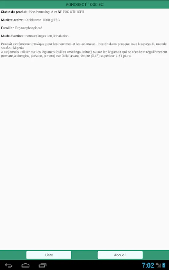 To use the app, start by choosing the type of pesticide you want to check (insecticides and acaricides, herbicides or fungicides). Then type the commercial name of the product to access its file or scroll down the list to choose the product you are interested in. Typically, the trade name appears large on the top of the label. Each sheet first tells you the status of the product, i.e. whether it is approved in Niger, not approved or prohibited. You can also know where the active ingredients of the product and their family, the targeted pests, the crops concerned and the modes of action, the current dosage and the safety criteria (time before harvest and time before returning to the plot) .