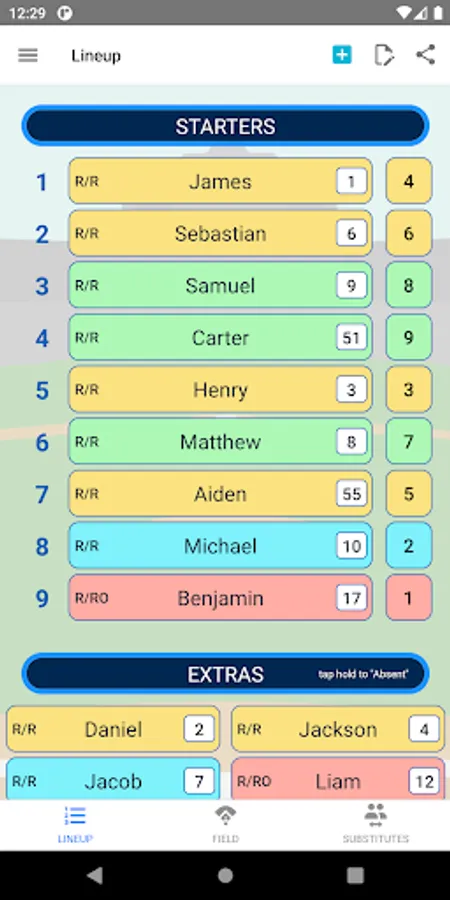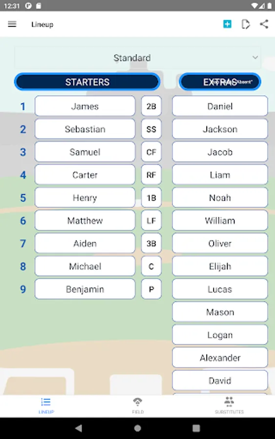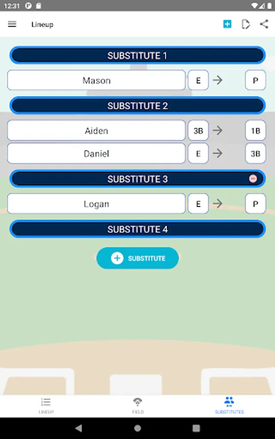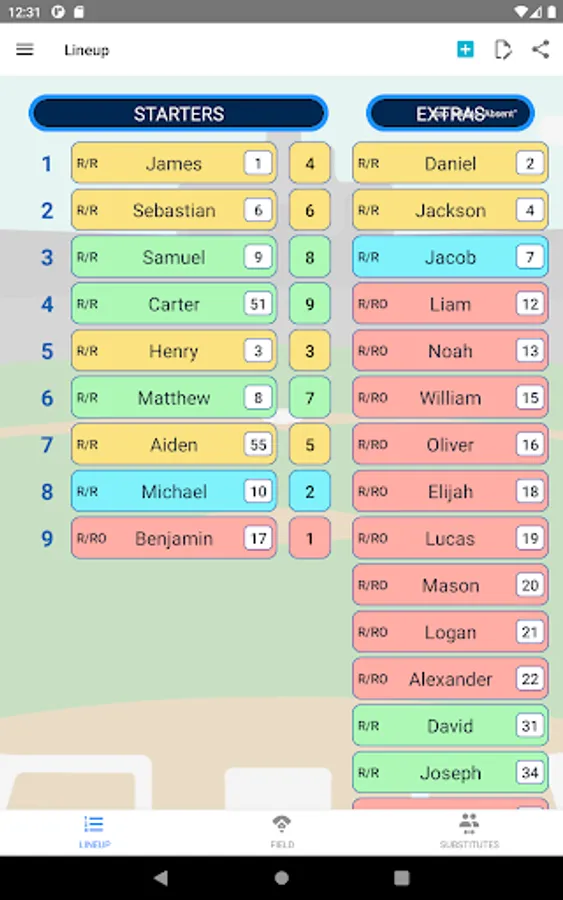 You can easily change the batting order and position. It can be displayed in lineup cards format and field format. You can also register for substitutes.