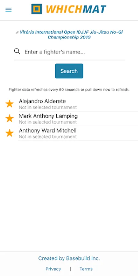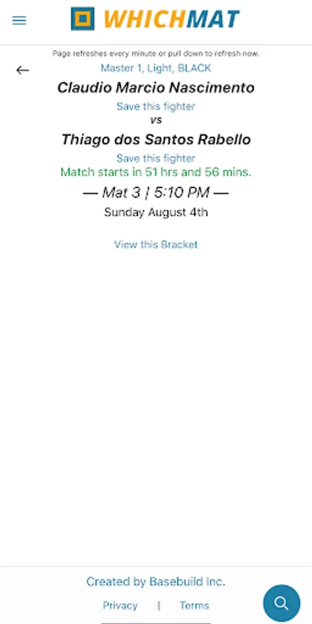 The WhichMat app was designed to help the IBJJF and it's fighters by making it quick and easy to find the mat time and location of your next fight. You can track multiple fighters at once in the order they are scheduled to fight. The quick access summary page lists your favorite fighters and which mat they are scheduled on next. Times and mat # are synced automatically with the ibjjf.com website data. Also included is a countdown timer to the next fight, updates of mat and time changes as well as the number of fights on your mat before your next match. WhichMat also includes quick links to brackets and more listed on the ibjjf.com website.