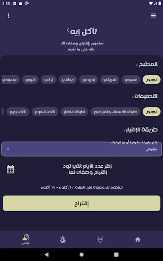 Confused eat what? Enough fights every day about today's food, and let the application suggest you the appropriate food, not only for today, not until the day you specify.