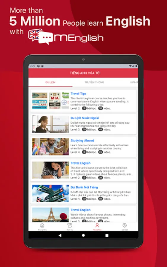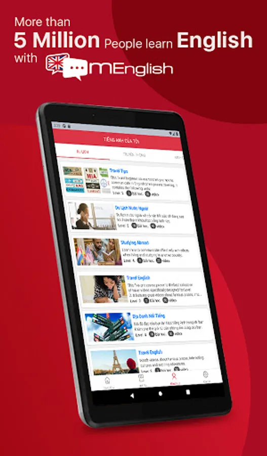 mEnglish is the best online English learning platform based on Google's voice recognition AI technology today. Students learn with more than 14,000 videos on different topics. All videos are copyrighted, prepared and produced by Cambridge University, Oxford University and National Geographic TV channel.