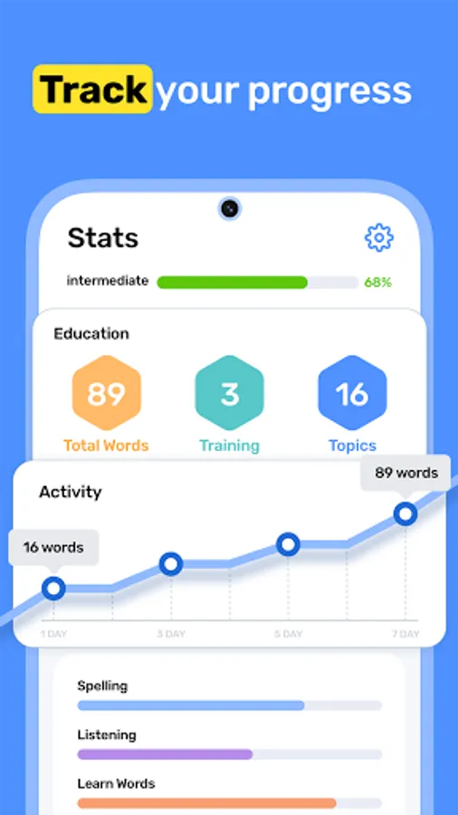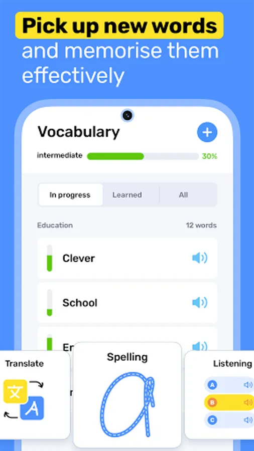 The learning process in Ule is based on spaced repetition method — a scientifically proven way to enrich vocabulary. We always determine your current skill level and provide you with a proper learning program. Each day you will learn 8 words, it’s about 250 words per month or 3000 words per year!