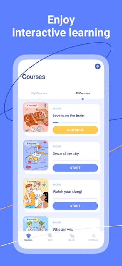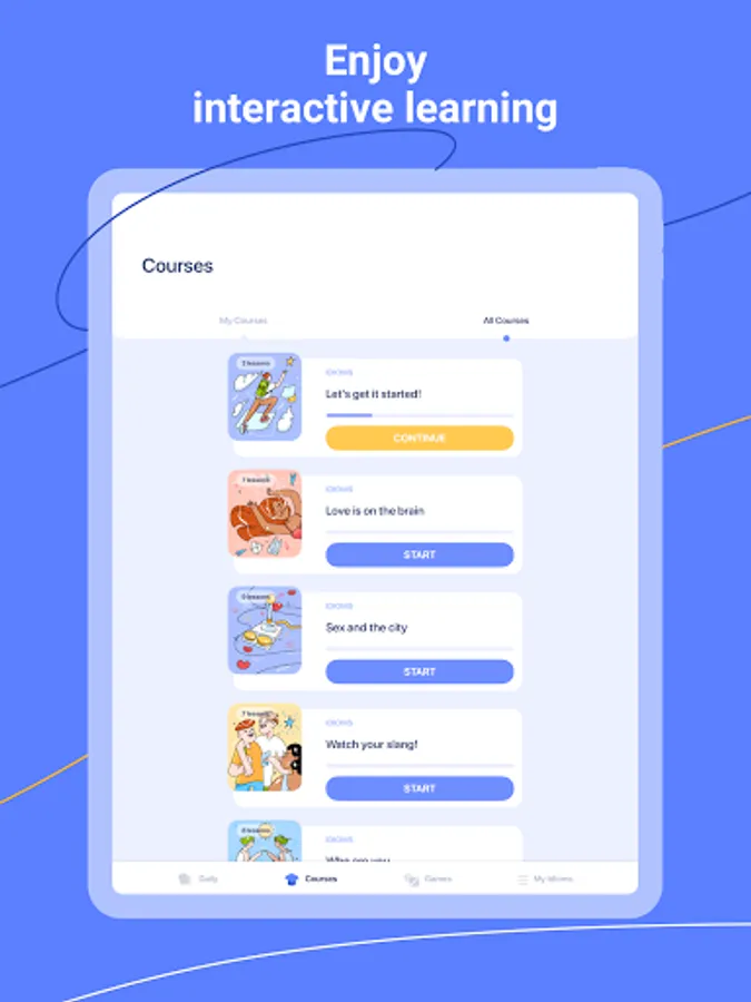 The Idioms App is constructed for better understanding and memorizing while being more a game than a theoretical practice.