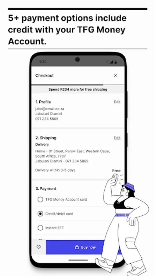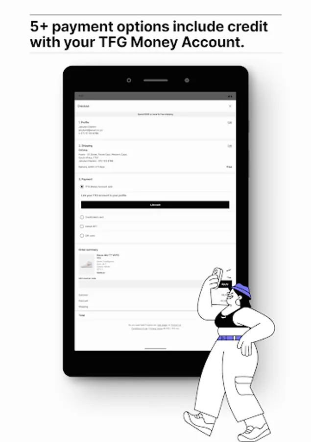 Payment options include Credit and Debit cards (Visa and MasterCard), your TFG Money Account card and EFT. You can also apply TFG gift cards.