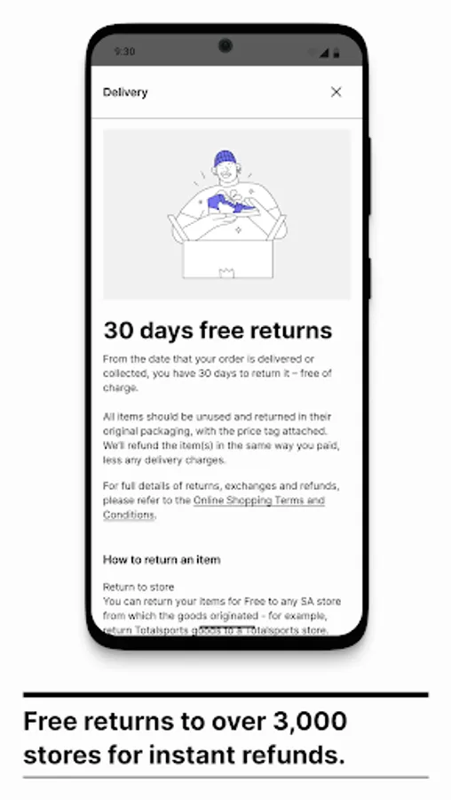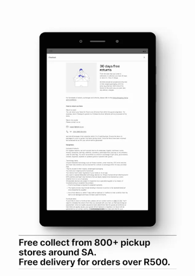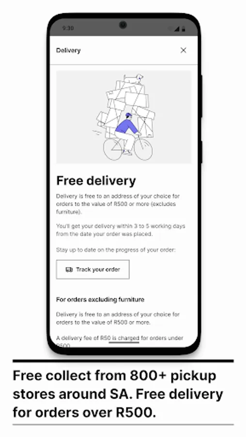 Free delivery for orders over R500 (excluding furniture) to your door within 3 - 5 working days. Free collection from 800+ collection points. End to end order tracking is available for active orders.