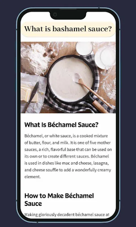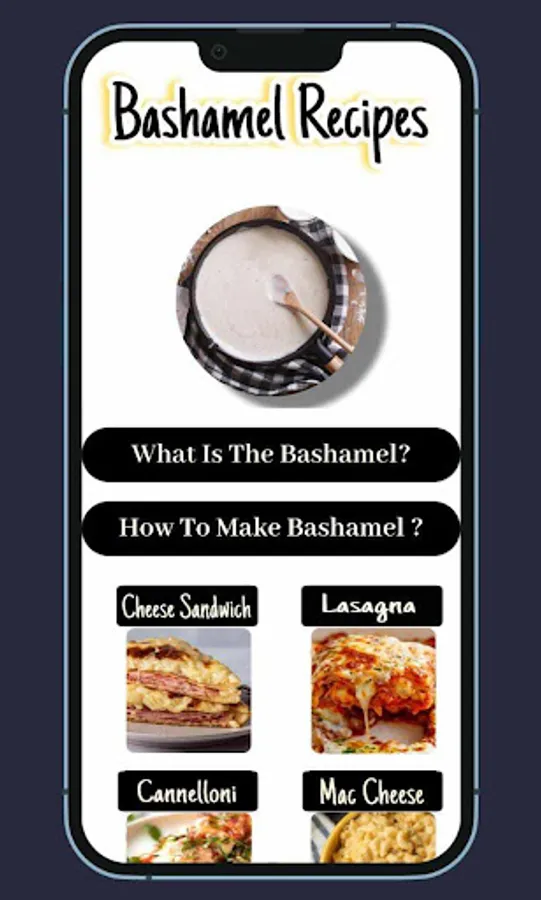 The most delicious recipes with the distinctive béchamel sauce, easy, new, quick to prepare and tested. The application contains sections for bechamel recipes, chicken bechamel recipes, macaroni recipes with bechamel, vegetable recipes with bechamel, meat recipes with bechamel