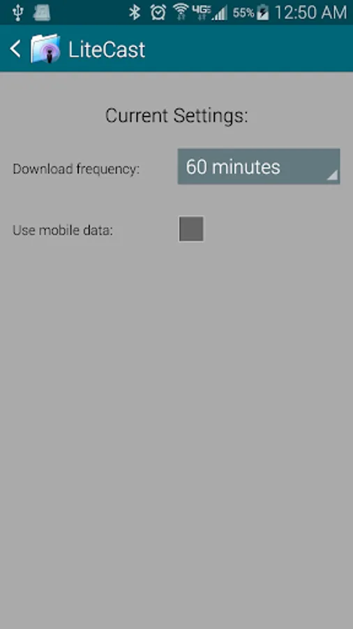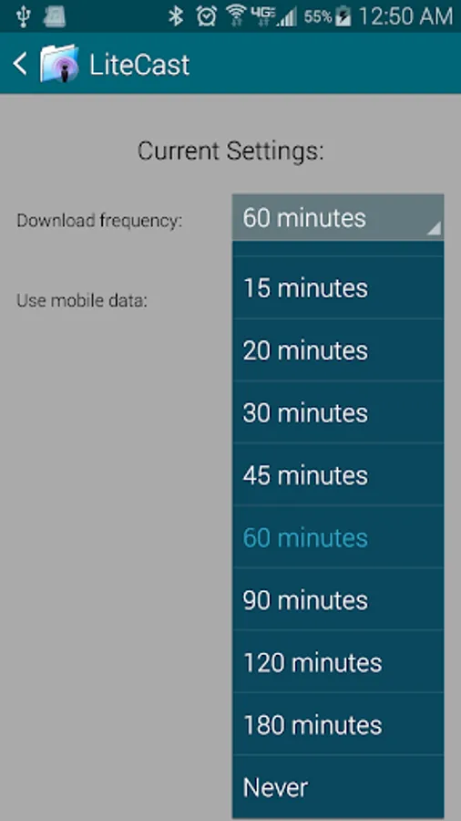 Customizable options include the ability to specify how often to check for new podcasts and whether mobile data usage is allowed for periodic downloads. Individual podcast sources can also be selectively enabled/disabled.