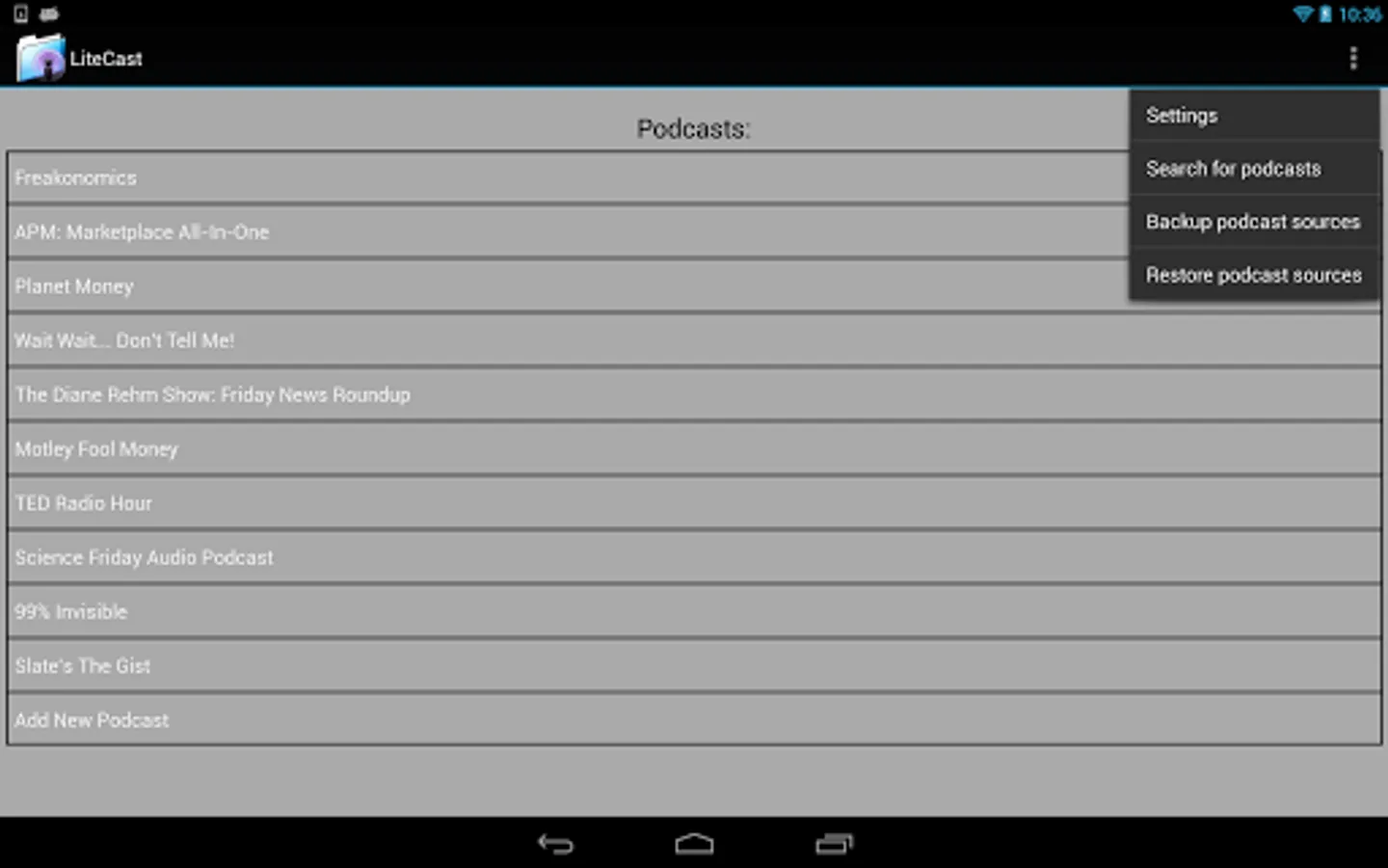 A simple, lightweight audio podcast grabber app. Will periodically check for new podcasts and automatically download them to your device. Easily search for and add your favorite podcasts by selecting the search option from the menu. Ability to add a podcast source URL manually if search fails.