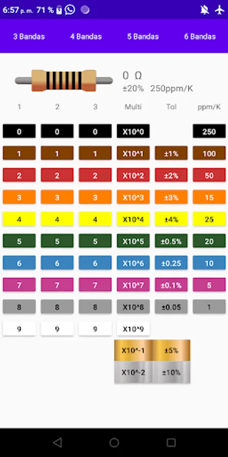 Resistance calculator with 3 to 6 colored bands, electronic tool for students and professionals in the field.
