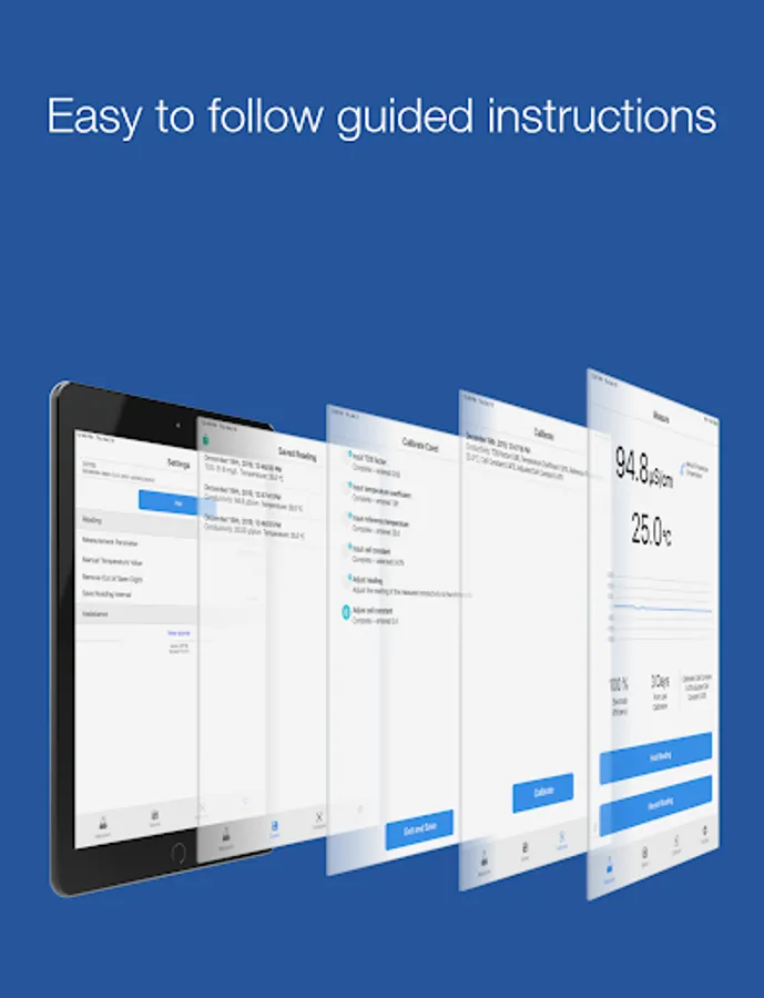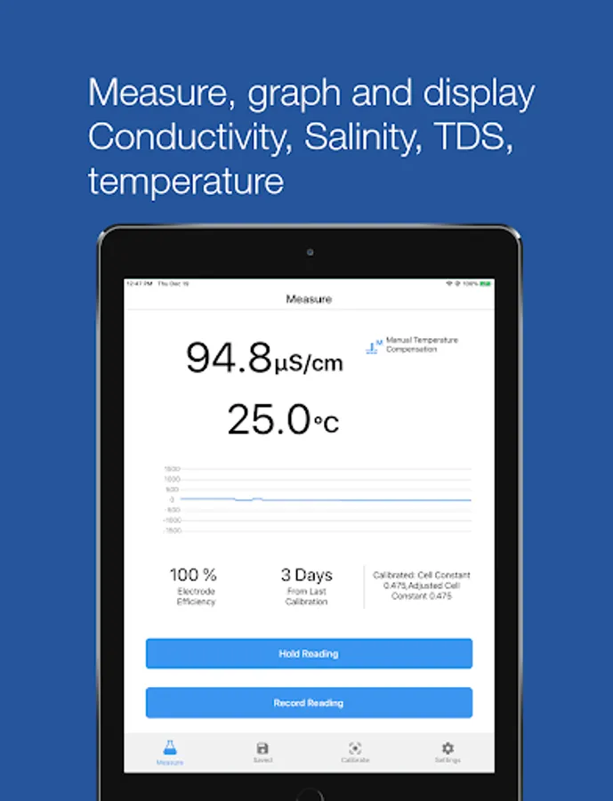 Display conductivity, salinity or TDS with temperature readings simultaneously with electrode efficiency, last calibration date and real-time graphing.