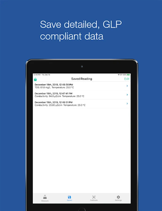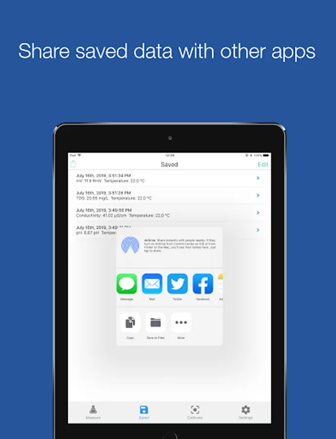 Transfer 750 saved measurement data from meter to app for sharing and further analysis. Measurement data includes EC and temperature values and calibration information.